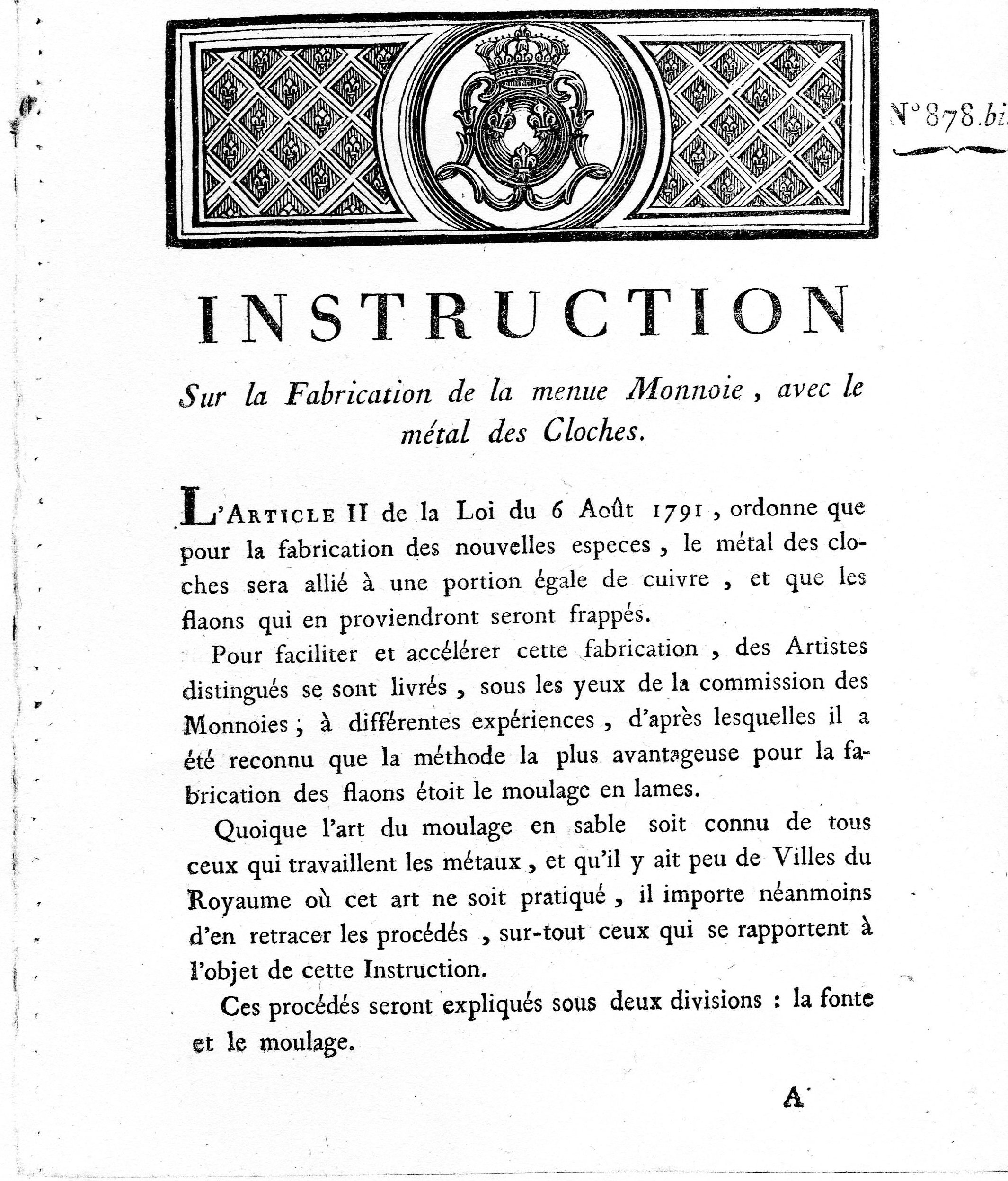Le procédé de fabrication du métal de cloche utilisé pendant la révolution pour frapper ces monnaies a fait l’objet d’une instruction officielle datée du 18 septembre 1791. A l’origine, cette instruction était destinée aux ateliers monétaires et apportait les solutions permettant de résoudre les problèmes posés par cet alliage hors normes.
