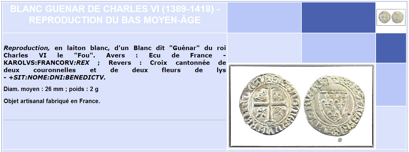 Aujourd’hui, je vois sur E-bay entre autres, qui ne fait rien pour lutter contre ce fléau et préfère engendrer des profits en fermant les yeux, des faux qui nous arrivent d’Europe, et qui copient les antiques et nos médiévales. Des vendeurs anglais et allemands, mais aussi beaucoup de français !!!, pour le plus gros de la troupe, nous proposent des monnaies de bien piètre facture en ne précisant surtout pas qu’elles sont fausses, bien évidemment, il faut bien que les enchères montent !!! Ces productions arrivent d’Albanie et, entre en Communauté Européenne par l’Italie, à quelques dizaines de kilomètres de bateau seulement, via l’Adriatique, ou alors sont vendues directement depuis les états de l’ex Yougoslavie. Nouveauté sur le marché, des faux médiévaux sans intérêt, comme ces copies de guénars de Charles VI d’origine française à priori, proposés par un « artisan » de bon niveau qui a déjà à son actif un catalogue typologique qu’il étoffe de jour en jour et, qui ferait bien mieux de mettre son adresse au service de son talent, en nous proposant des œuvres originales et personnelles issues de son inspiration, comme un véritable artiste créatif le fait, plutôt que de se contenter de la pauvre médiocrité de son ETRE, en ne faisant que copier ce que d’autres ont déjà produit il y six siècles. Sans intérêt ! Je le répète car, même si l’on ne collectionne pas cette période et que l’on désire juste avoir un exemplaire pour faire un rapide historique numismatique en préambule de sa collection de royales ou modernes, on trouve sur le marché des authentiques de belle facture et de belle conservation à des prix bien inférieurs à 40 €uro, frais de port inclus. C’est un type monétaire extrêmement commun et financièrement très abordable, et pour un petit budget, vous aurez la satisfaction incomparable d’avoir une VRAIE monnaie médiévale dans votre médailler.
