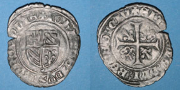 Cuisery – gros – point secret sous les lettres B des légendes – frappée du 4 juillet 1420 au 27 février 1421 – billon 25mm – environ 1g74 – coll. Oleg – référence Françoise Dumas-Dubourg : 15-4-3 |