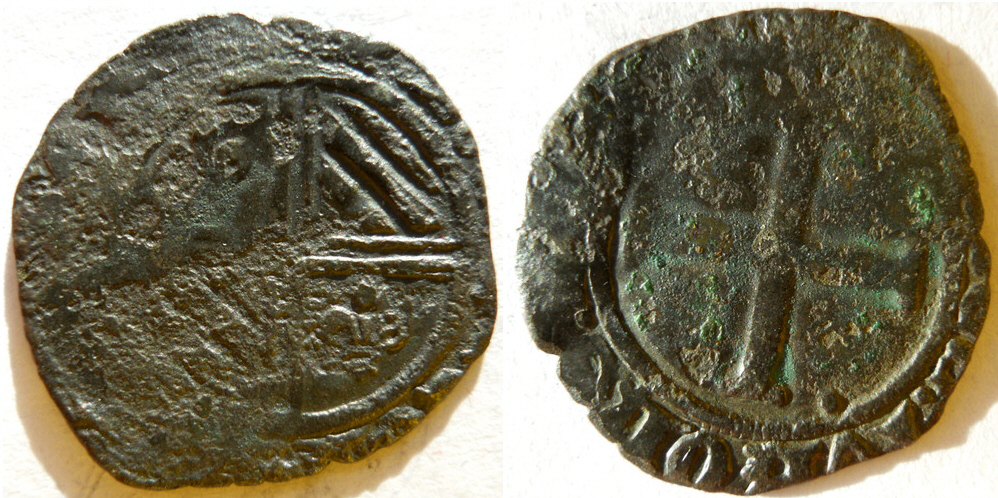 Cuisery – guénar au point sous l’écu et croissant sous le O de IOhAneS à l’avers – 2ème émission de l’atelier sur le pied 40ème frappée entre le 13 juillet 1416 et 16 avril 1417 – billon environ 25mm – 1g91 – coll. Oleg – référence Françoise Dumas-Dubourg : 14-6-1 |