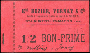 St Laurent lès Mâcon – de ? à 1938 – Etab. Rozier, Vernay & Cie – 1/8 BON-PRIME n°1560 – impression uniface noire sur carton blanc 100 x 60 mm avec souche – coll Oleg |