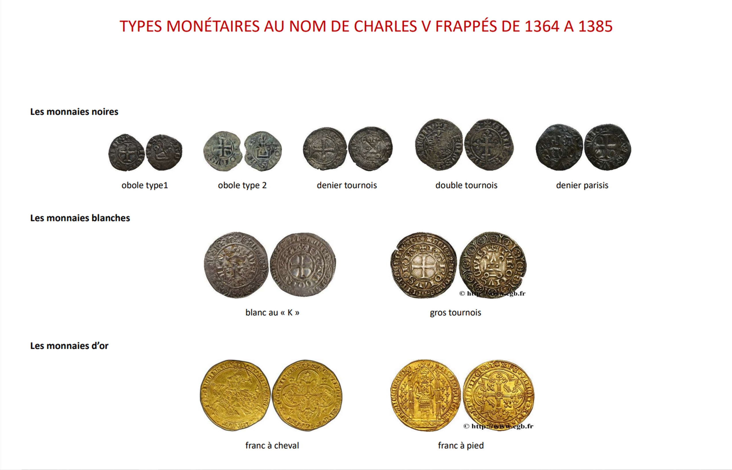 Pour les monnaies noires j’ai retrouvé ; 2 types d’obole, le denier tournois, le double tournois, et le denier parisis, pour les monnaies blanches ; le blanc au « K », et le gros tournois et pour les monnaies d’or ; le franc à cheval, et le franc à pied (dénommé ainsi depuis un texte officiel de 1377, alors que sa dénomination première était « denier d’or aux lis »)