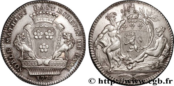 Il en est de même pour les jetons de la ville de Lyon dont celui-ci daté de 1776. Si le blason de l’échevin Mathieu Rast est sommé d’une couronne comtale, les armoiries de la ville au revers sont accompagnées des allégories du Rhône et de la Saône mais ne sont pas couronnés.