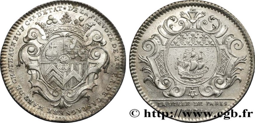 Ainsi, ce jeton en argent daté de 1723 porte à l’avers les armes de Pierre Antoine de Castagnère, marquis de Châteauneuf avec, parmi les ornements extérieurs, une couronne de marquis telle que définie en matière d’héraldique. Par contre, au revers, les armes de la ville de Paris ne comportent pas de couronne.
