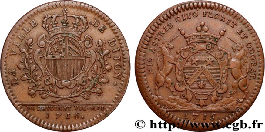 Cependant, les armoiries des villes pouvaient arborer une couronne reflétant son statut et son passé. Ainsi les jetons de Dijon présentaient une couronne rappelant l’histoire de cette ville, capitale du duché de Bourgogne, et le rattachement de ce dernier au domaine royal.