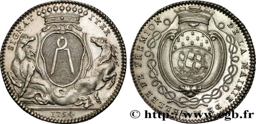 La présence d’une couronne murale dans les armoiries des villes intervient à partir de 1754 sur les jetons de la ville de Nantes comme le montre clairement cet exemplaire aux armes de Jean-Baptiste de Gellée de Prémion. Novatrice, elle se substituait alors à une couronne comtale. Au fil des années, les cinq tours de la couronne murale nantaise vont s’affiner et devenir plus nettes. Il ne semble pas que d’autres villes l’aient utilisé sur leurs jetons à la même époque.